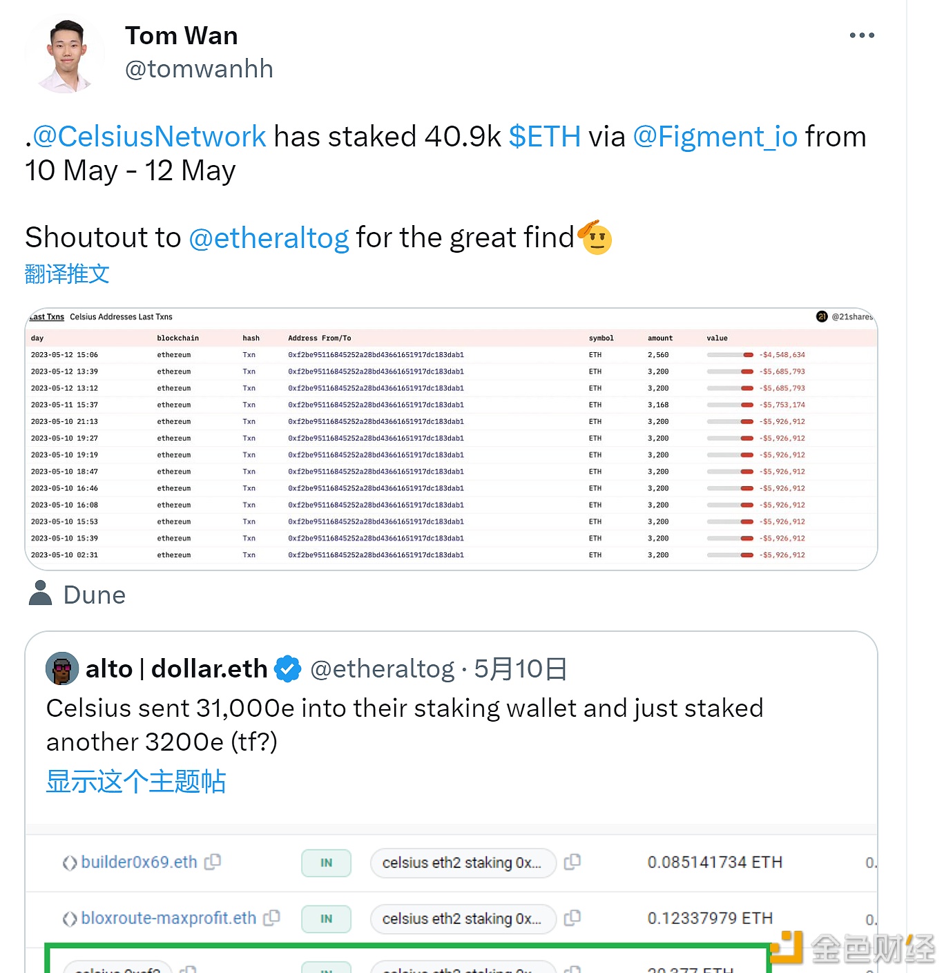 21.co研究员TomWan发文表示,5月10日至5月12日期间,加密借贷平台Celsius已通过质押服务商Figment质押约4.09万枚ETH。